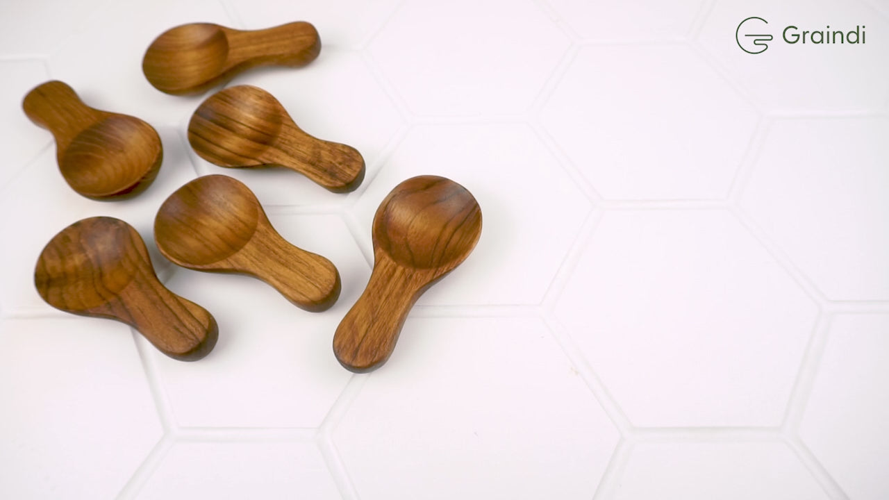 - Small teak wood condiment spoons suitable for sugar, spices, coffee, and ice cream.